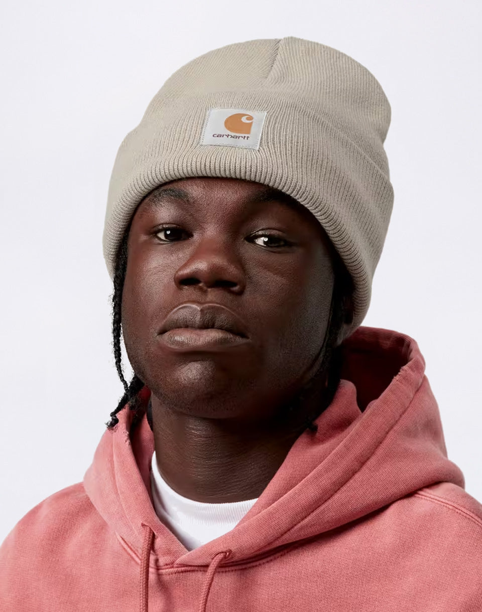 Carhartt WIP Acrylic Watch - a hat with Carhartt patch on his forehead and a folded bottom hem.