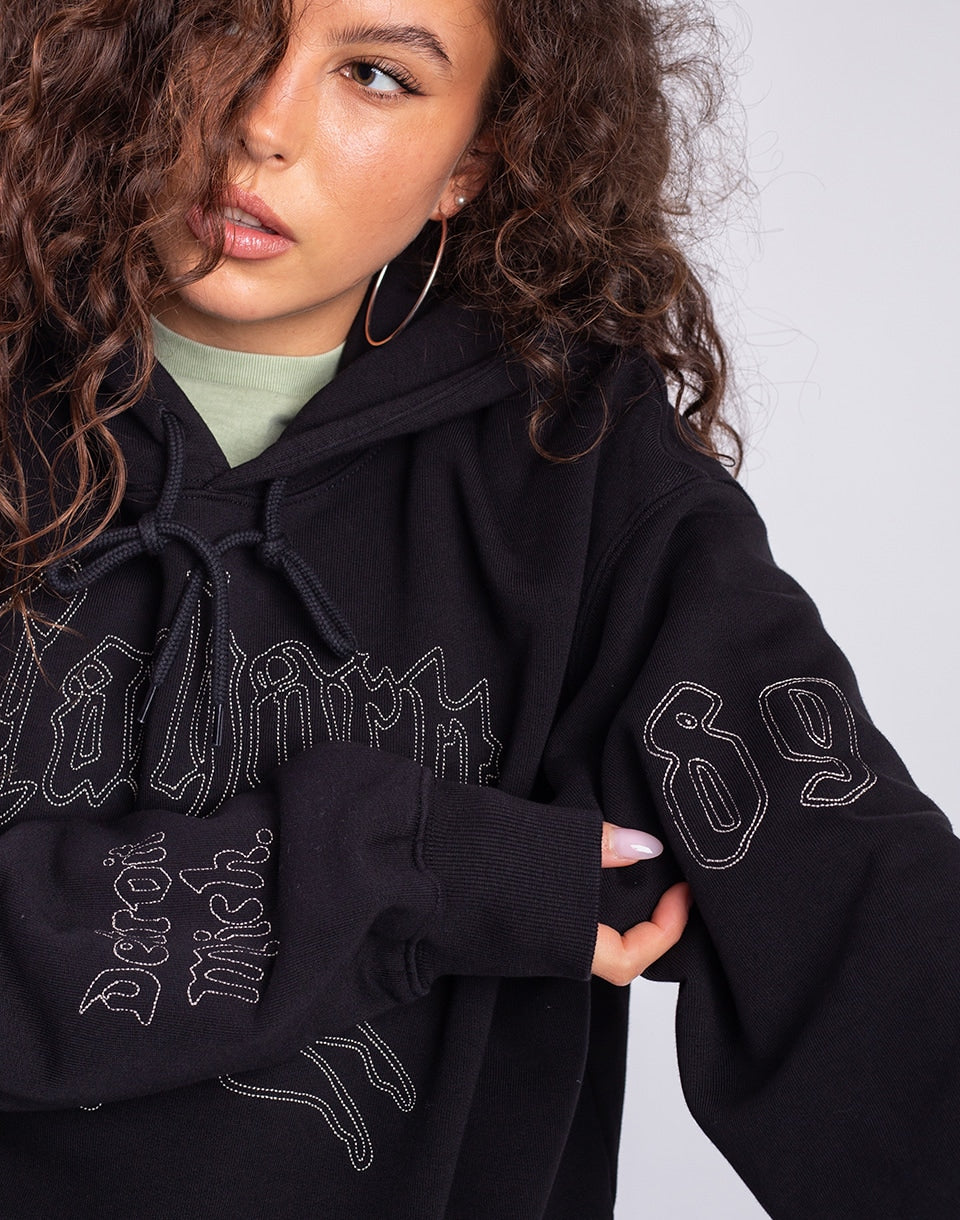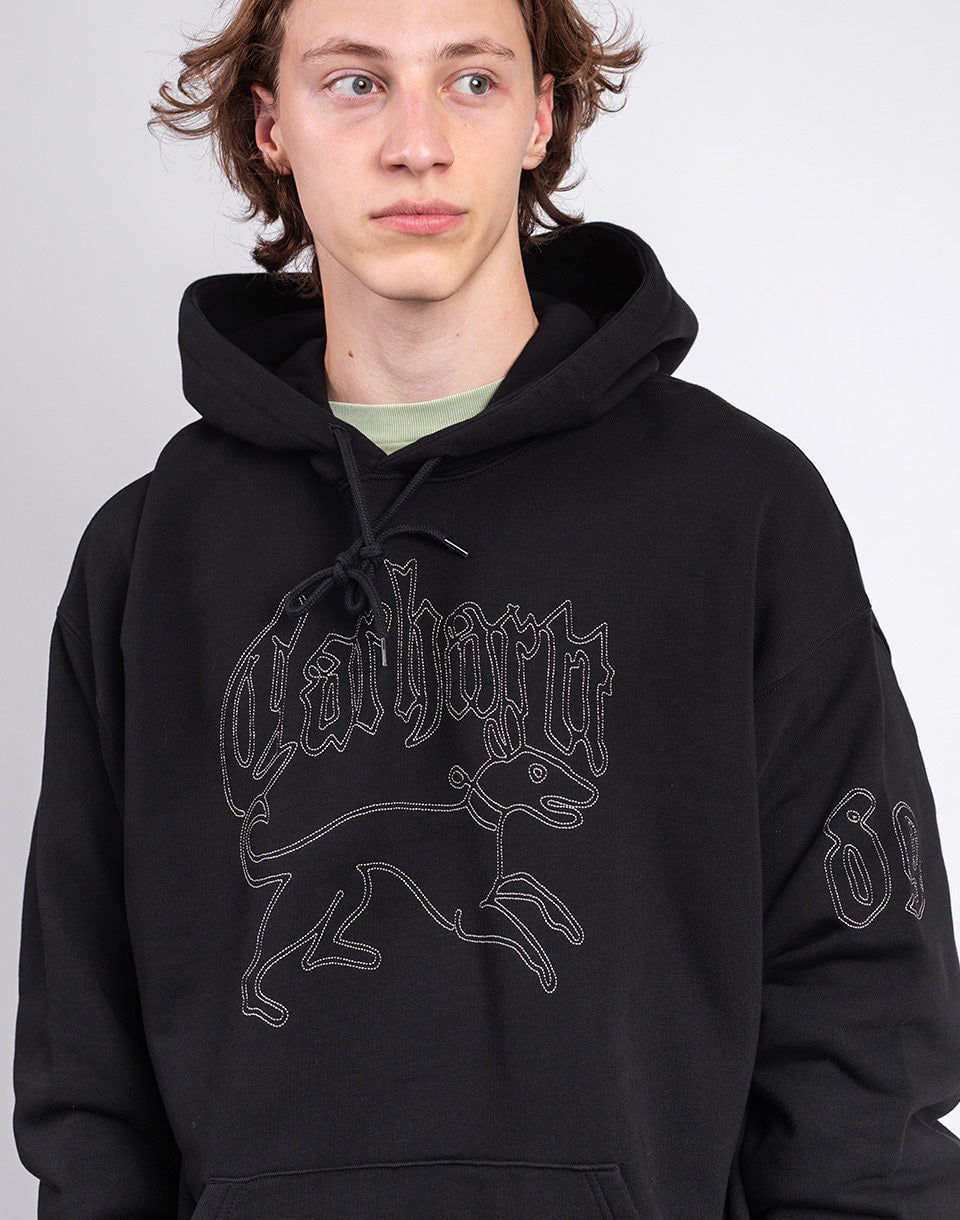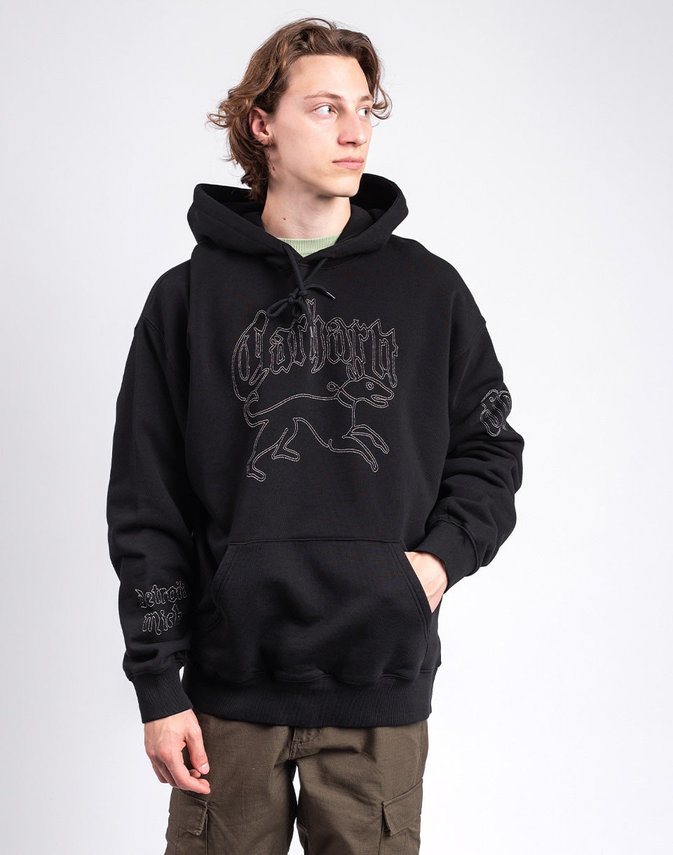 Carhartt WIP Hooded Hackwork Sweat - wide unisex hoodie with kangaroo pocket and large graphic embroidery on the chest and sleeves, backed by the famous streetwear brand.