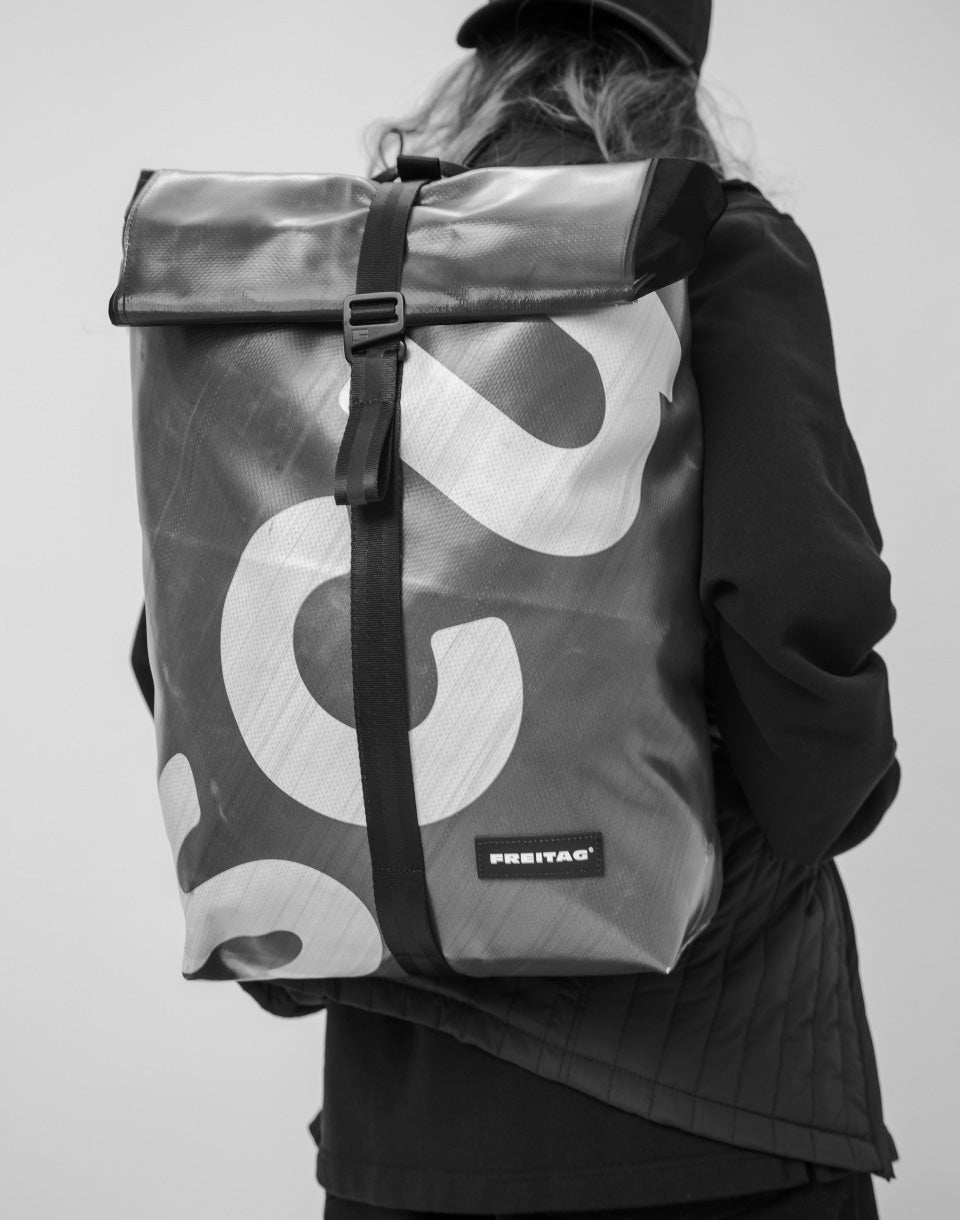 FREITAG F155 Clapton - a unique handmade rolltop backpack made from used truck tarps, seat belts and recycled PET bottles.