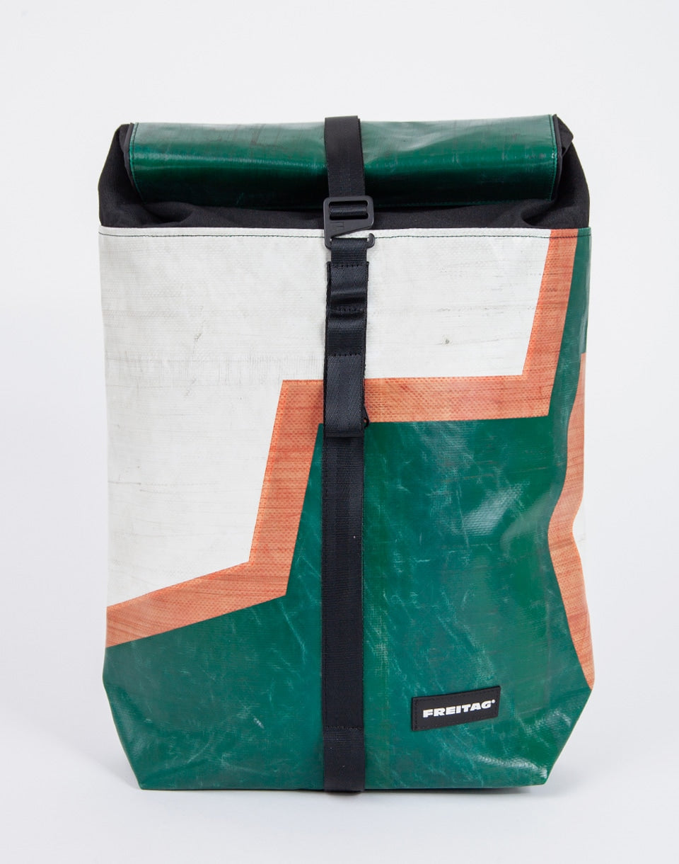 FREITAG F155 Clapton - a unique handmade rolltop backpack made from used truck tarps, seat belts and recycled PET bottles.
