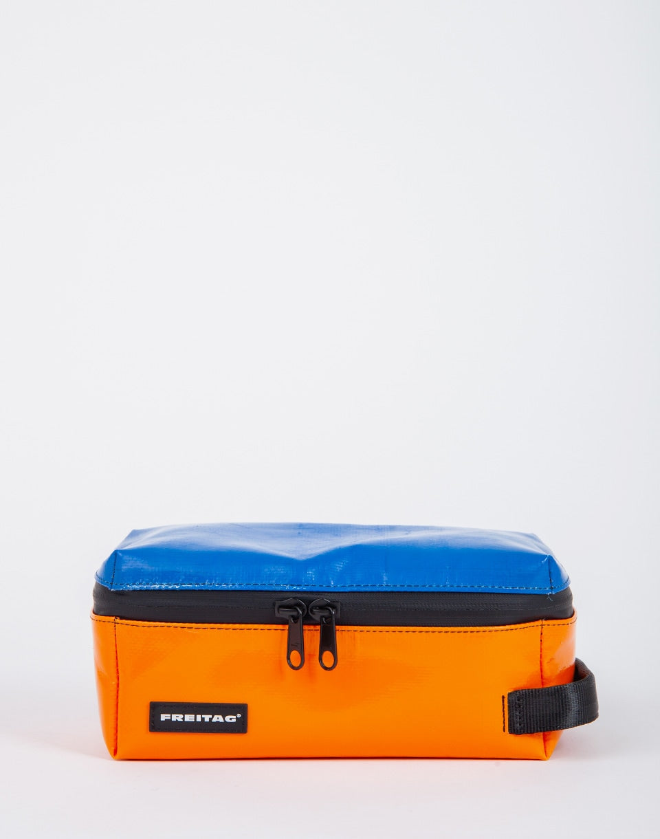 FREITAG F36 Wayne - medium-sized cosmetic bag made from used truck tarps and upcycled seat belts. Thanks to practical compartments, it will be an ideal travel partner.