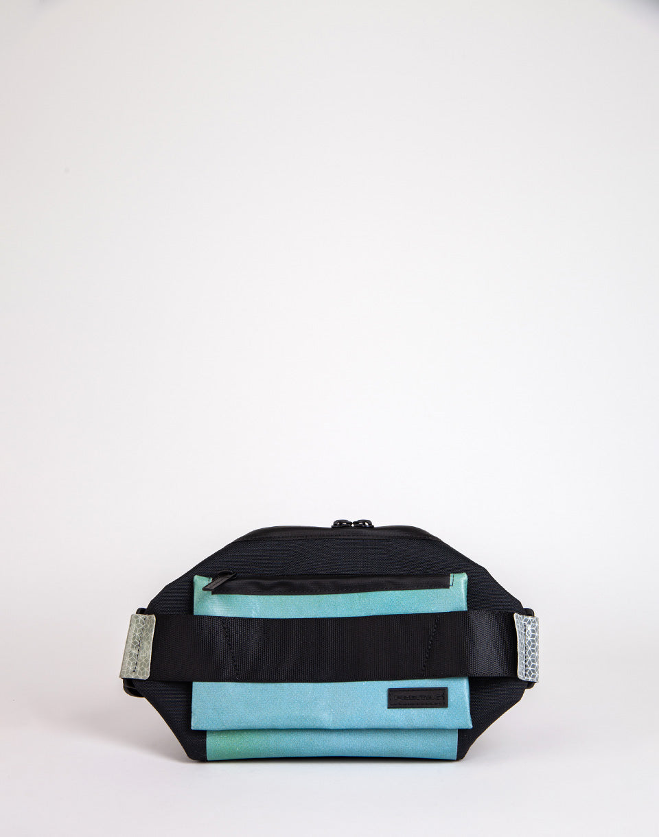 FREITAG F675 DIXON - reflective, recycled and unique sling bag made from recycled PET bottles, discarded truck tarp, reflective recycled truck contour markings and B-stock car safety belts.