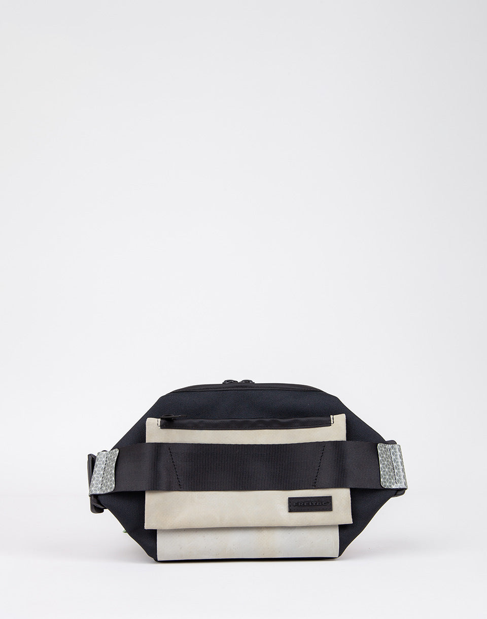 FREITAG F675 DIXON - reflective, recycled and unique sling bag made from recycled PET bottles, discarded truck tarp, reflective recycled truck contour markings and B-stock car safety belts.