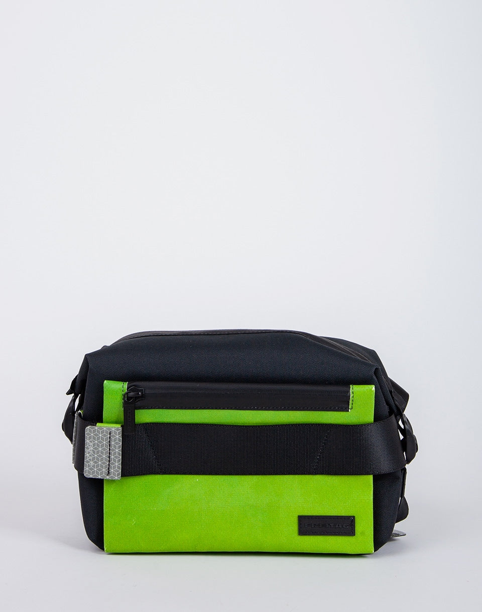 FREITAG F670 WARREN - reflective and unique crossbody bag with adjustable shoulder strap, which can be worn as a larger kidney. It is made from recycled PET bottles and complete with parts of retired truck sails including recycled reflective markings.