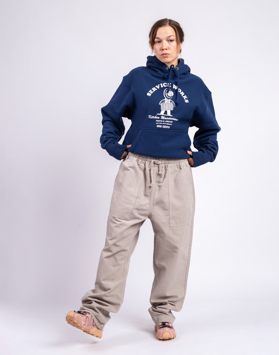 Founded in 2020, Service Works is a brand inspired by its founder's culinary experience. It was originally created out of his love for comfort and elastic waistbands, which were a common part of his life in the kitchen. The classic range of trousers combines elements of traditional chef wear with carefully selected, heavier organic materials to ensure comfort in everyday wear.